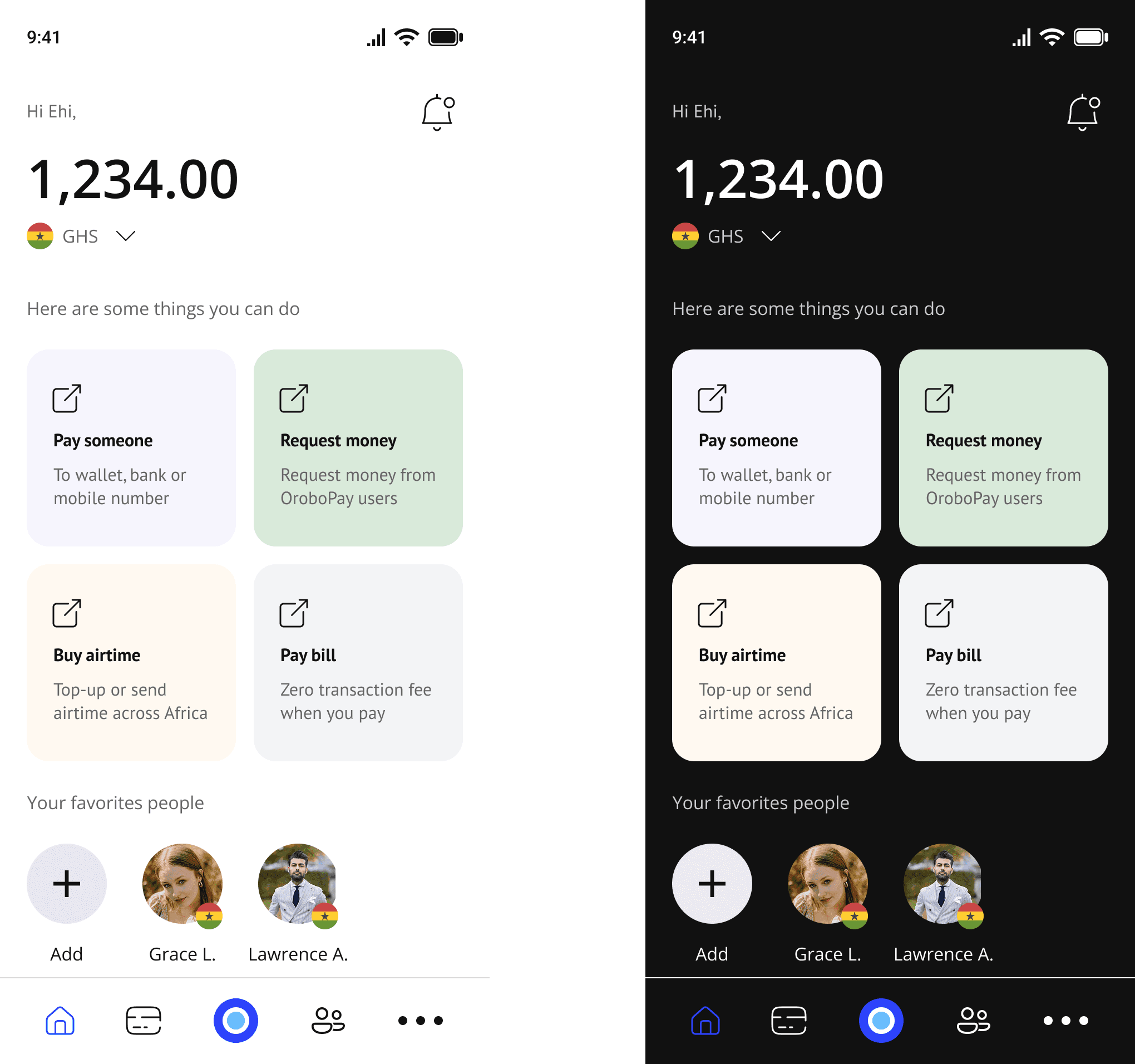 I used Auto Layout to ensure the mobile design adapted naturally across screen sizes and content variations. Each section - from greeting to bottom nav - was built with vertical stacks and consistent spacing. Action cards and favorite contacts wrapped cleanly, and the bottom menu remained anchored regardless of content height. This setup allowed me to simulate scrollable behavior and test layout integrity without manual overrides.